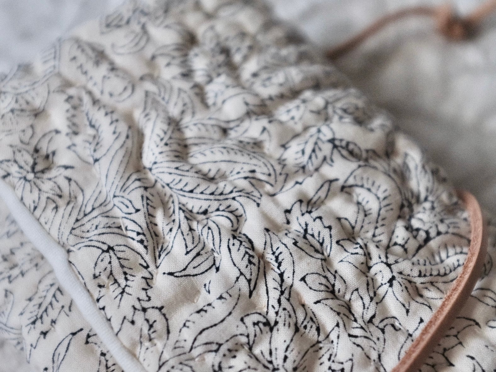 手刺ししたキルト生地のポーチのような物。